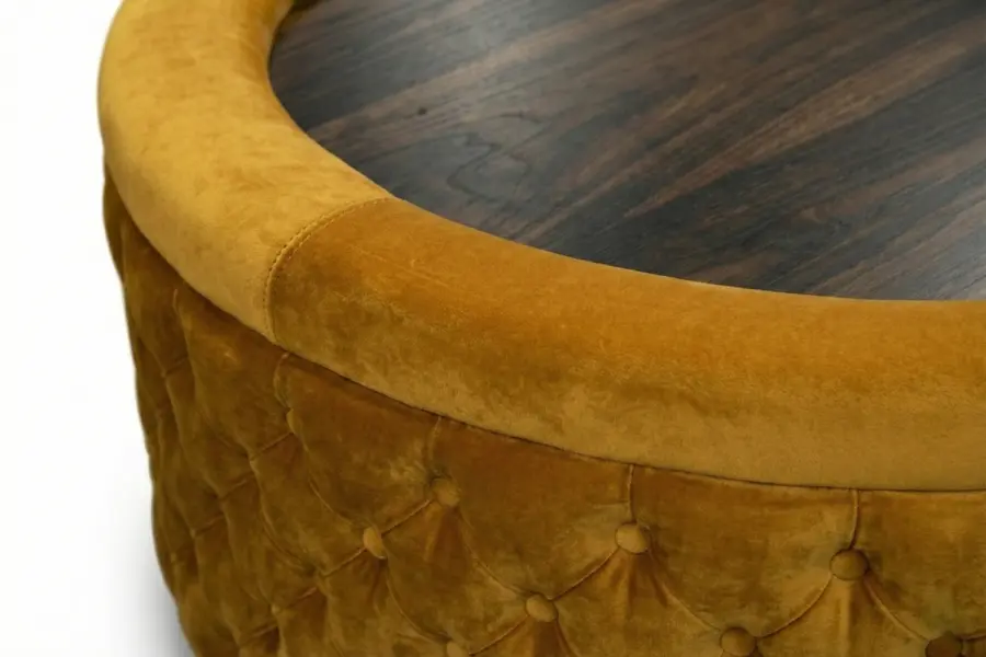 The Vine Ottoman Table blends traditional elegance with practical versatility in a refined circular design. A richly button-tufted upholstered body surrounds a smooth, inset wooden top, creating a balanced composition of texture and utility. The contrast between the tailored perimeter and the polished surface makes it an ideal centerpiece for living rooms, lounges, or sophisticated seating arrangements where both form and function are essential.