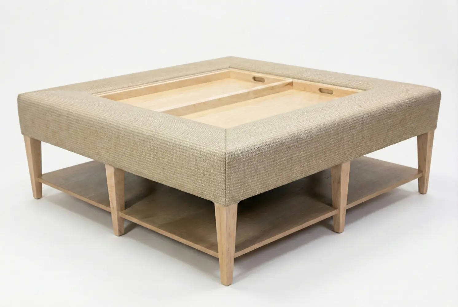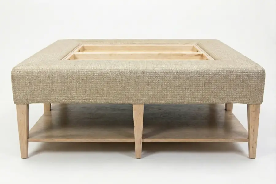 The Willow Ottoman is a versatile centerpiece that seamlessly combines comfort, surface utility, and integrated storage. A wide upholstered perimeter frames a recessed center fitted with two removable wooden trays, creating a stable surface for serving, entertaining, or displaying décor. Beneath, a spacious lower shelf adds functional storage, enhancing its practicality within living rooms, lounges, or multi-functional interiors.