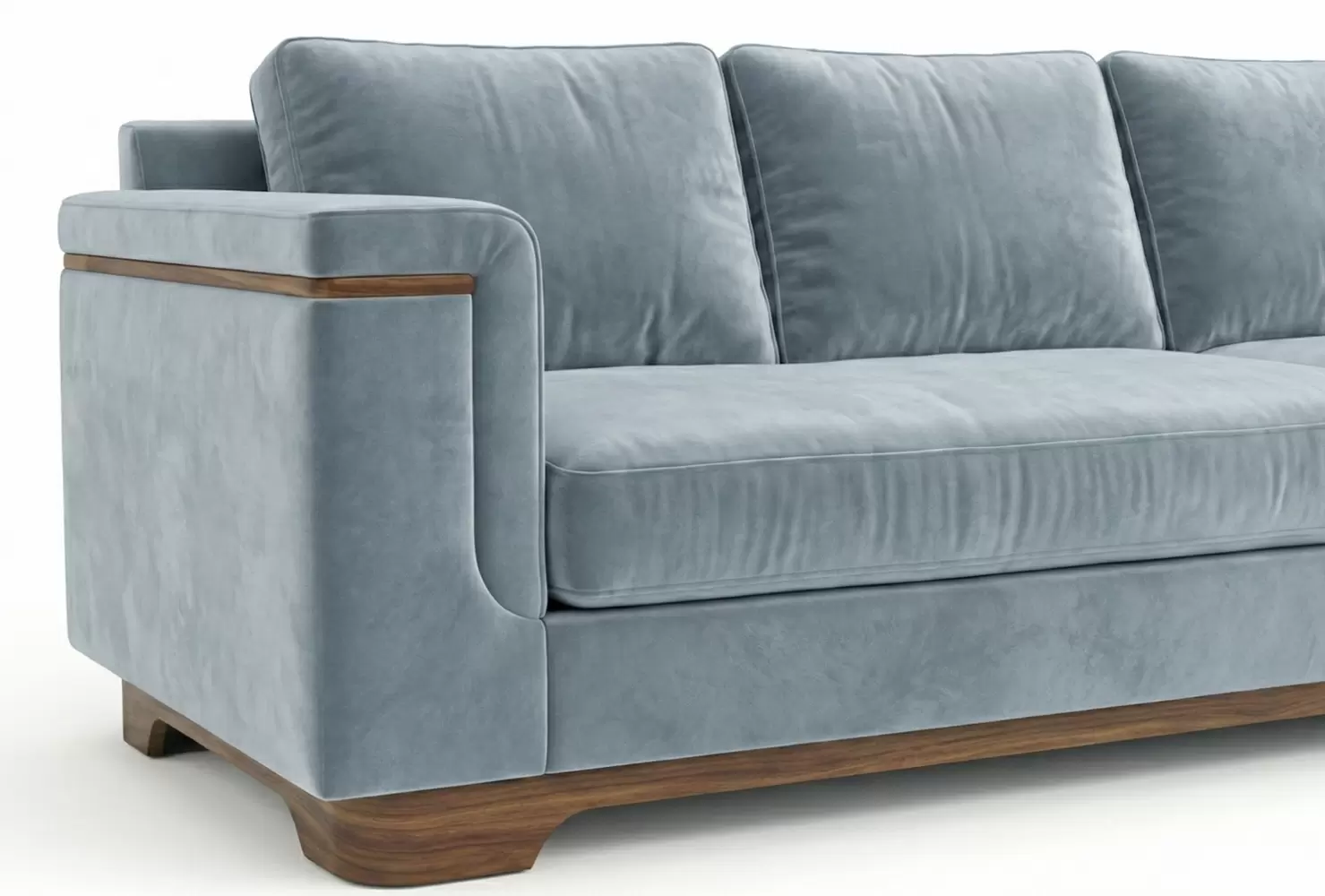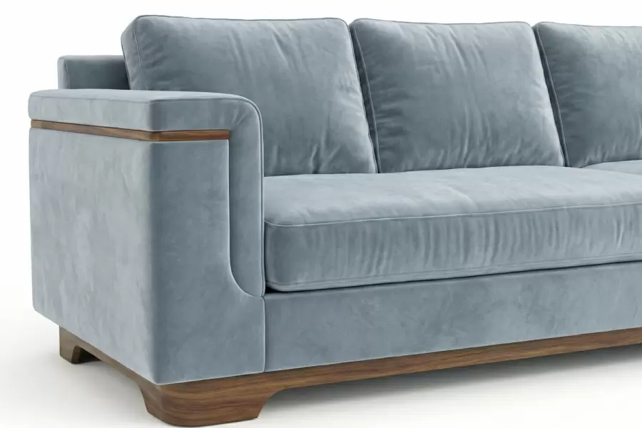 The Strata L-shaped sectional features an elegant solid wood base with matching inset arm detailing. Fully adaptable, it offers custom sizing, bespoke wood finishes, and is designed specifically for C.O.M. application.
