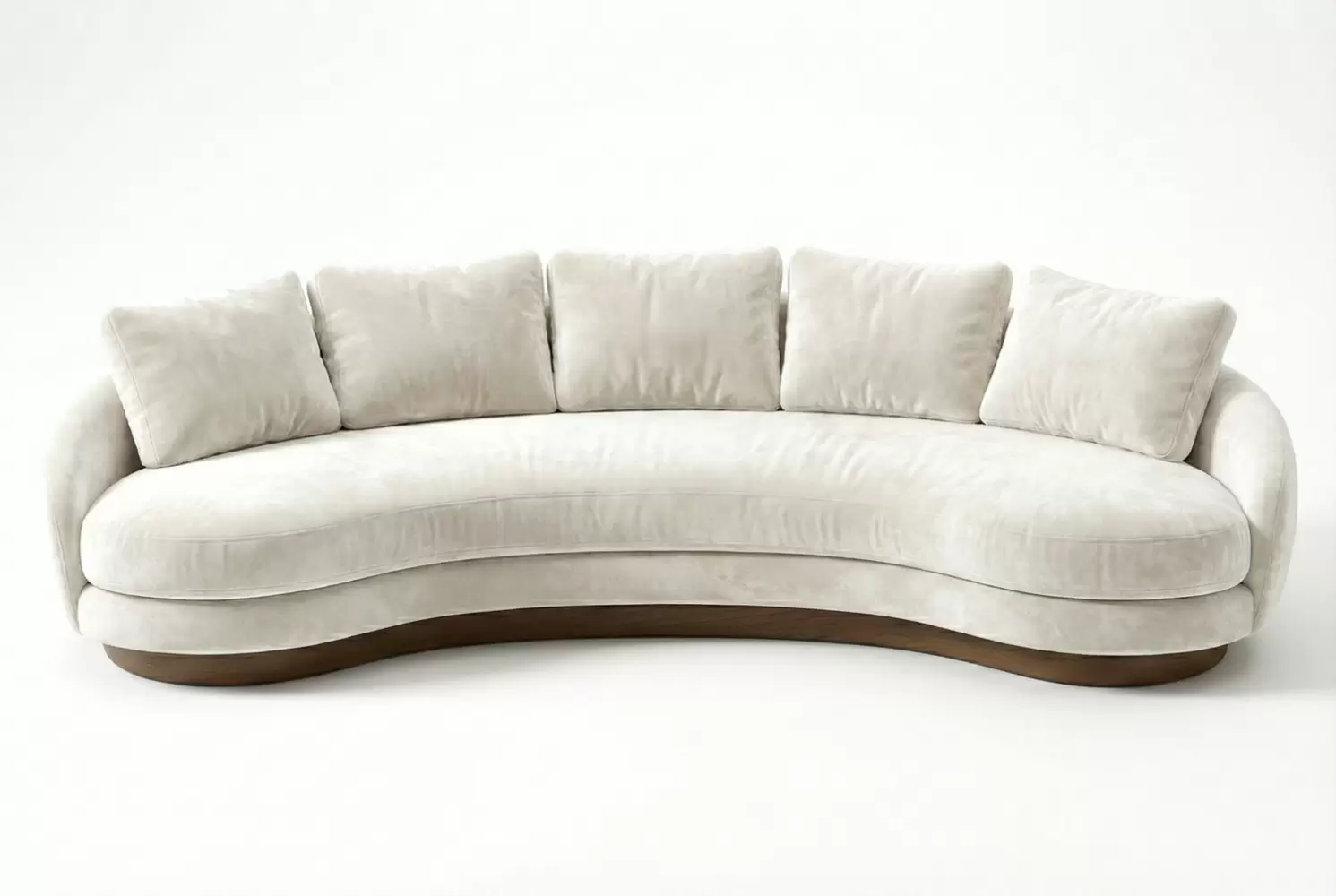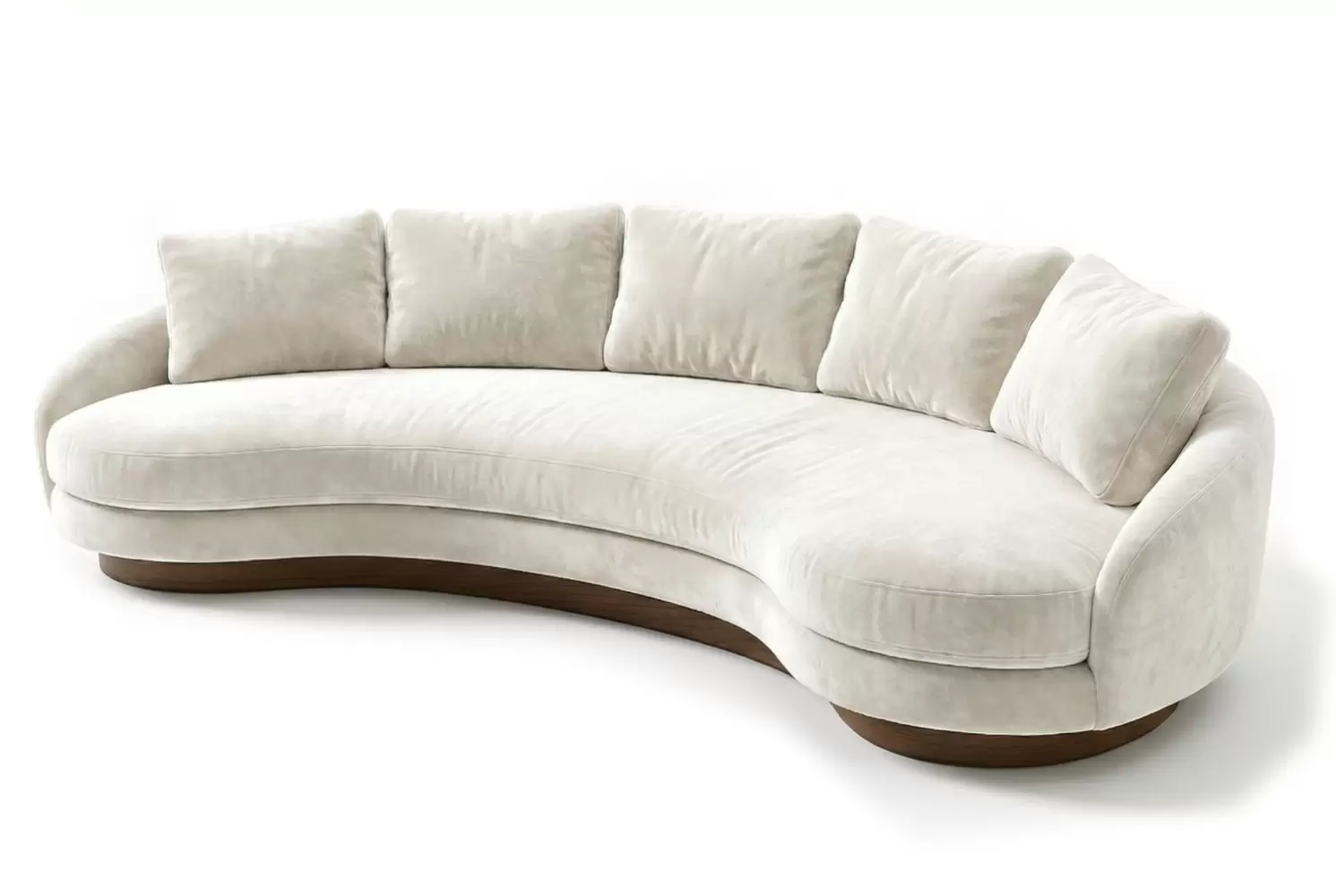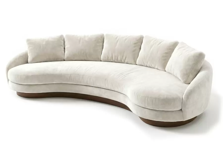 This sculptural sofa defines your living space with its elegant, crescent silhouette. Featuring a spacious single bench seat and five loose back cushions, it offers a welcoming environment for conversation. The design is grounded by a continuous dark wood plinth base that follows the gentle contour, adding a sophisticated architectural detail. Can be custom shaped and sized to specification